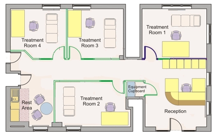 The clinic has been refurbished internally to provide a large reception area, four treatment rooms and a staff rest area. Private toilets including disabled facilities are adjacent.